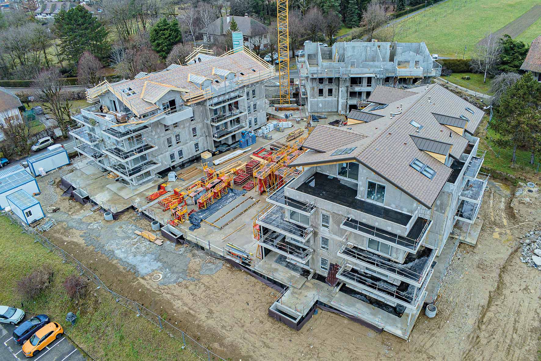 Bien que bénéficiant d’un panorama exceptionnel sur les massifs environnants, de la Chaîne du Mont Veyrier jusqu’au Semnoz, nos charpentiers restent concentrés sur leur ouvrage ! Le premier bâtiment ayant été terminé il y a quelques semaines, ils s’affairent désormais sur le second en réalisant notamment les liteaux qui supporteront la couverture qui sera prochainement posée.